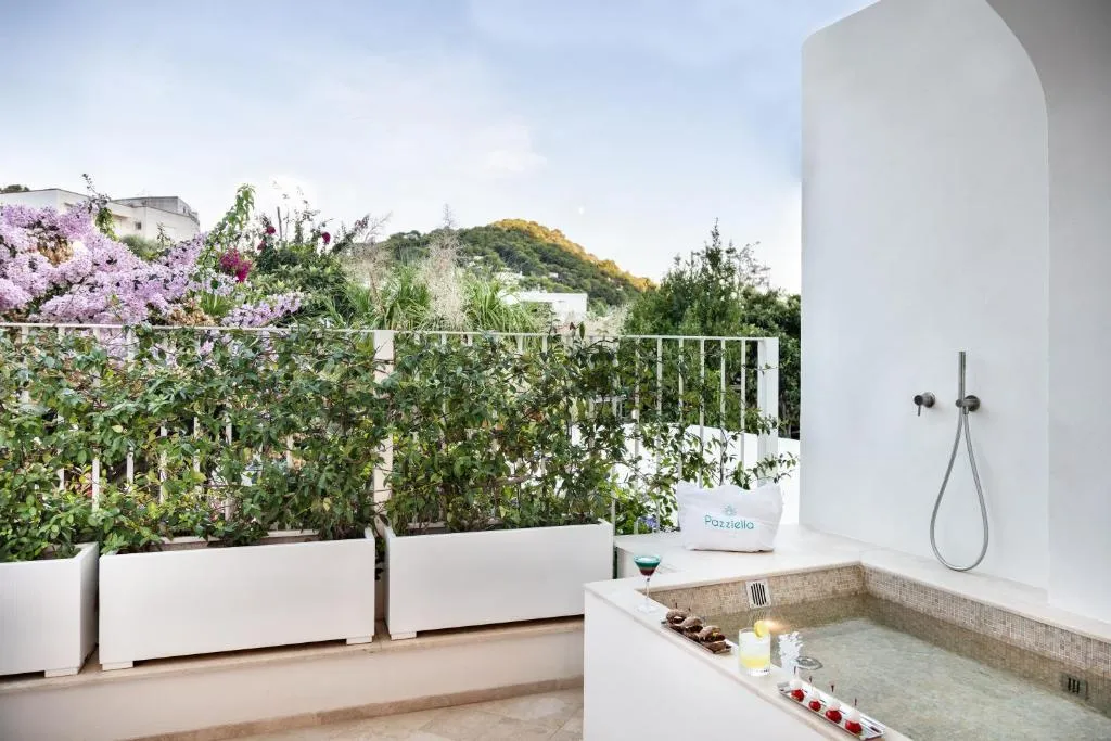 Pazziella Garden & Suites is a serene oasis nestled in Capri Town, steps from the iconic Piazzetta. Surrounded by lush gardens and lemon groves, it offers stunning Mediterranean views and exceptional service. The contemporary rooms blend modern amenities like air conditioning, satellite LCD TV, and minibar with charming antique furniture. Complimentary Wi-Fi extends throughout. Enjoy the tranquil pool set within the gardens, or opt for private luxury with select suites featuring their own pool or outdoor jacuzzi. Capri's Funicular Railway Station is conveniently close, ensuring easy access to Marina Grande and onward connections to Naples, Ischia, and Sorrento.